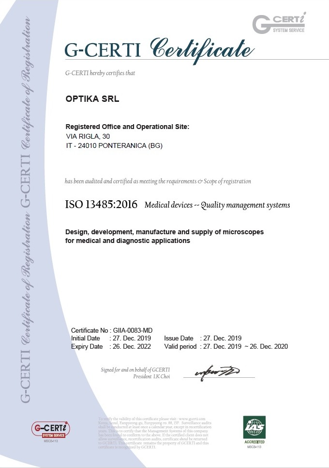 O kvalitě mikroskopů OPTIKA svědčí i certifikát, kterým jsou biologické mikroskopy OPTIKA schváleny jako zdravotnické přístroje. Tuto certifikaci mají mikroskopy OPTIKA od roku 2019.